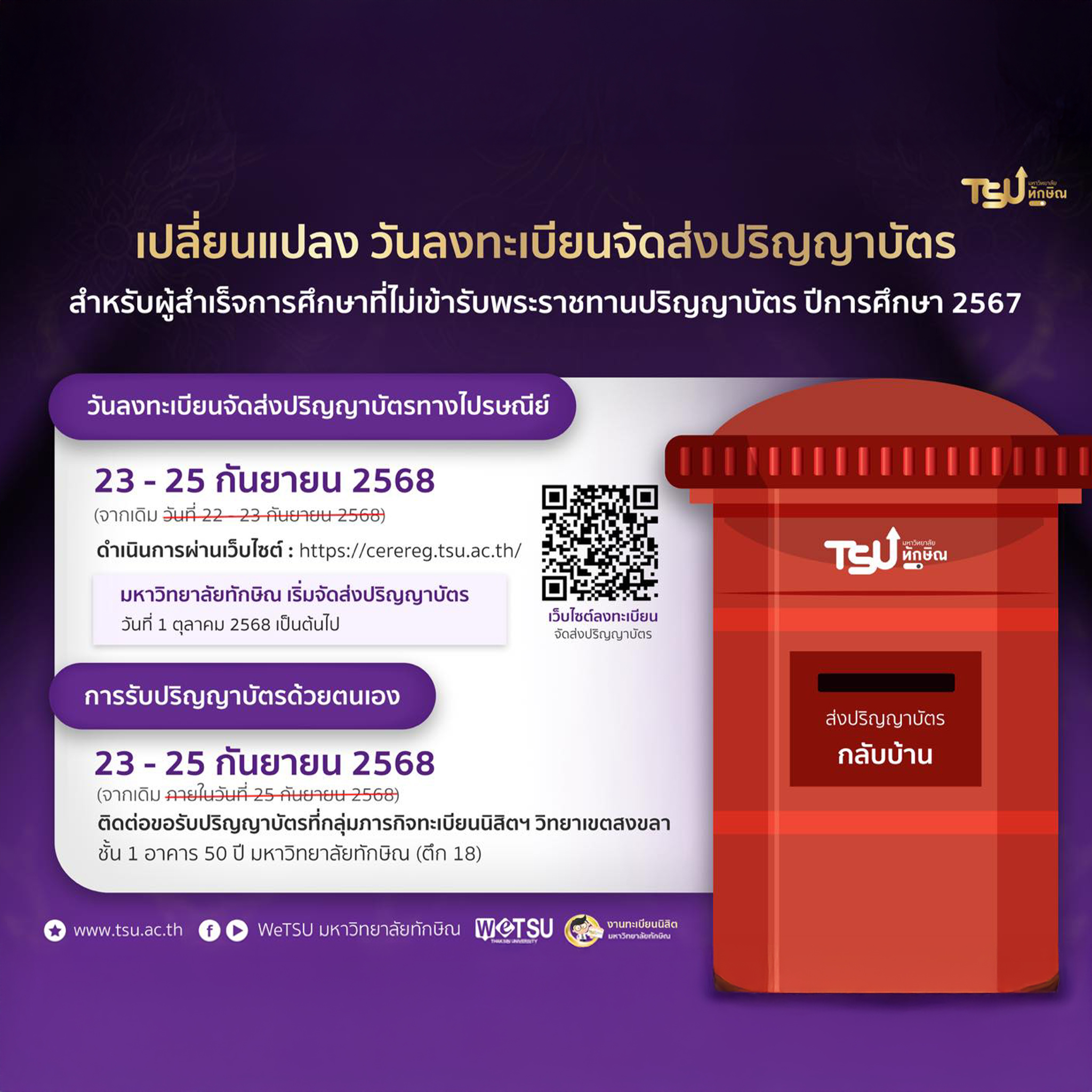 • ประกาศมหาวิทยาลัยทักษิณ เรื่อง กําหนดวันลงทะเบียนแจ้งความประสงค์เข้ารับพระราชทานปริญญาบัตร ประจําปีการศึกษา ๒๕๖๗